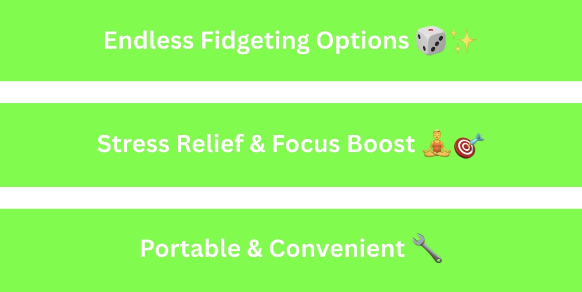 Designed to improve concentration and reduce stress, the Fidget Dice work by giving your hands something to do while your mind stays engaged. Whether at work, home, or school, the Fidget Dice can help you stay calm and focused in high-pressure situations. The simple act of fidgeting can be a powerful tool for calming your nerves.