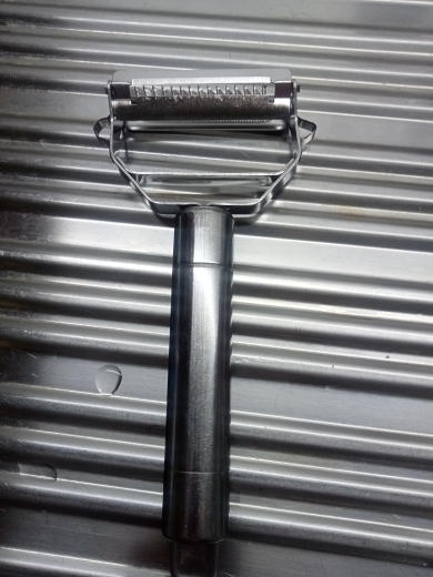This double-head vegetable peeler is designed for fast and easy peeling and slicing. One blade efficiently peels fruits and vegetables, while the other creates long, thin julienne strips for cooking or garnishing.